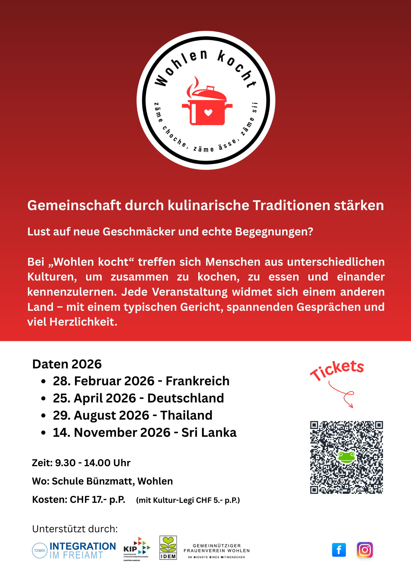 Flyer Wohlen kochtAuch dieses Jahr lädt «Wohlen kocht» wieder zum gemeinsamen Kochen ein. An vier Daten werden vier verschiedene Länder kulinarisch bereist.